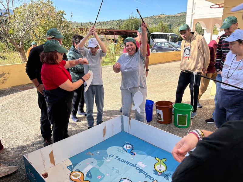 Ιδιαίτερα ξεχωριστό και χαρούμενο μέρος της ημέρας αποτέλεσε το βιωματικό σκέλος της δράσης. Μέσα από διαδραστικά παιχνίδια, όπως «Ο κρυμμένος θησαυρός των σκουπιδιών», το «μπάσκετ με ανακυκλώσιμα υλικά» και το «ψάρεμα των σκουπιδιών» για τον καθαρισμό του βυθού, οι ωφελούμενοι συμμετείχαν ενεργά, ανακαλύπτοντας ότι τα απορρίμματα μπορούν να μετατραπούν σε έναν πολύτιμο «θησαυρό» όταν διαχειρίζονται σωστά. Η εμπειρία ανέδειξε με τρόπο χαρούμενο και εκπαιδευτικό τα πολλαπλά οφέλη της ανακύκλωσης και της κυκλικής διαχείρισης, από την εξοικονόμηση φυσικών πόρων έως τη βελτίωση της ποιότητας ζωής.