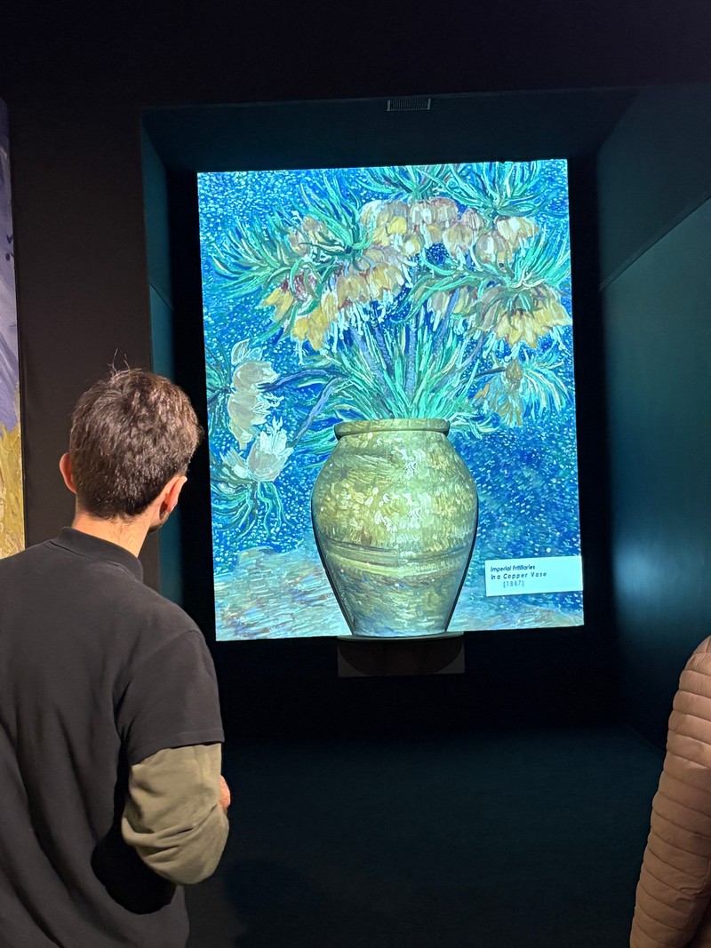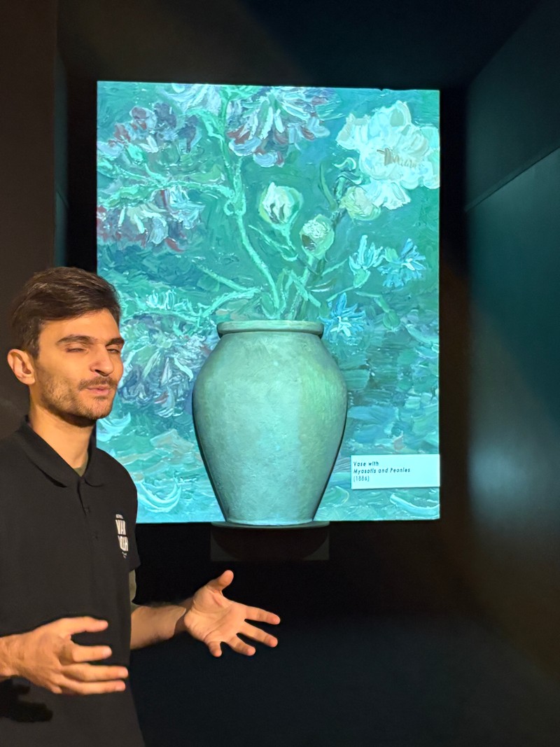 Μπαίνοντας στον χώρο της έκθεσης, οι συμμετέχοντες βρέθηκαν κυριολεκτικά «μέσα» στους πίνακες του Βίνσεντ βαν Γκογκ. Γιγαντιαίες οθόνες προέβαλαν σε κάθε τοίχο, αλλά και στο δάπεδο, τα πιο γνωστά έργα του μεγάλου καλλιτέχνη, σε συνεχή κίνηση. Τα χρώματα, οι γραμμές και τα μοτίβα του βαν Γκογκ απλώνονταν γύρω τους, δημιουργώντας μια οπτικοακουστική ατμόσφαιρα που τους επέτρεπε να νιώσουν την ένταση, τη συγκίνηση και τη ζωντάνια της τέχνης του.